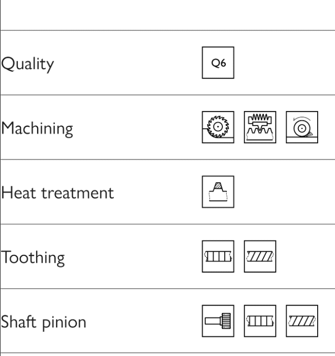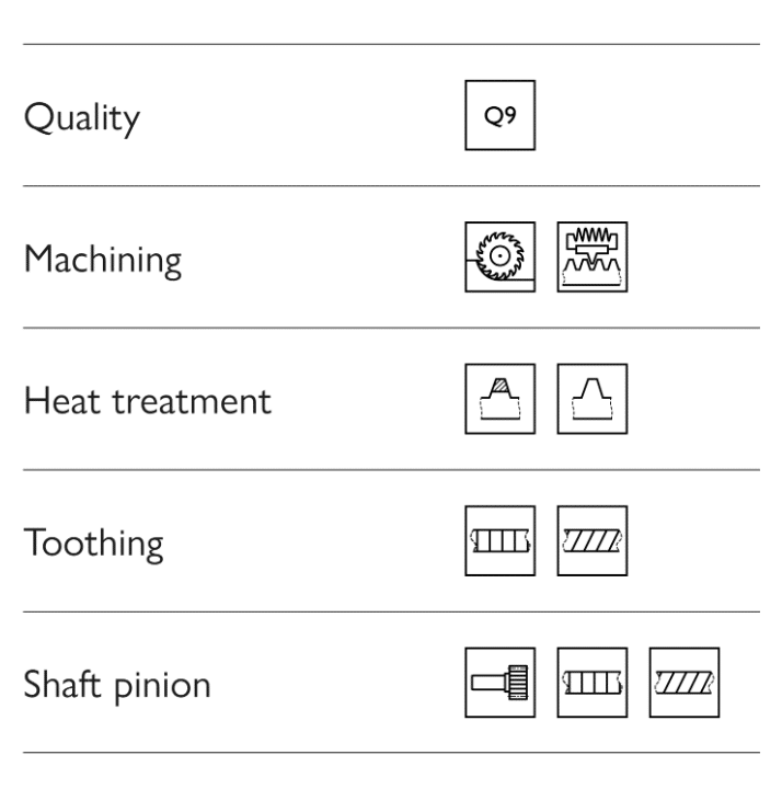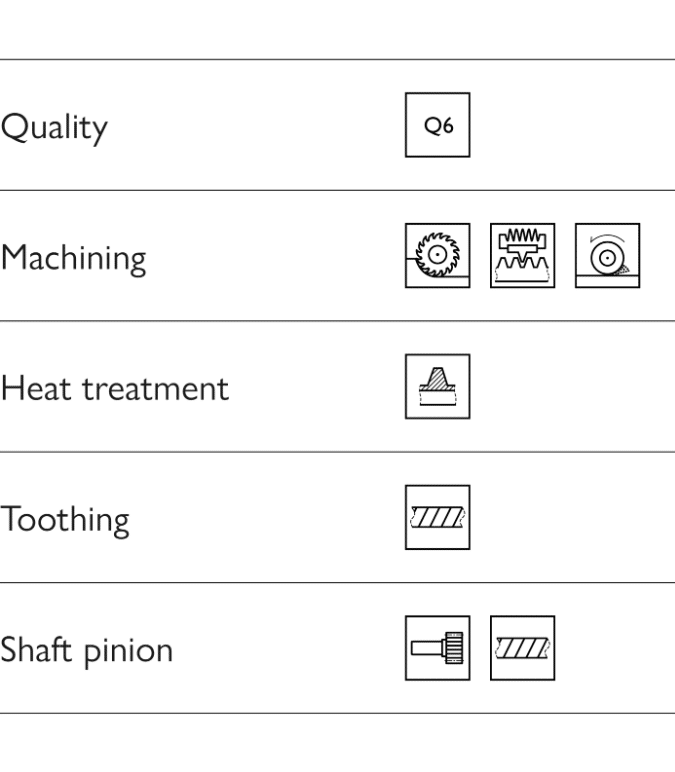 | Tooth treatment | Hardened flanks and tooth root | Hardened flanks | Hardened or non-hardened (milled) |