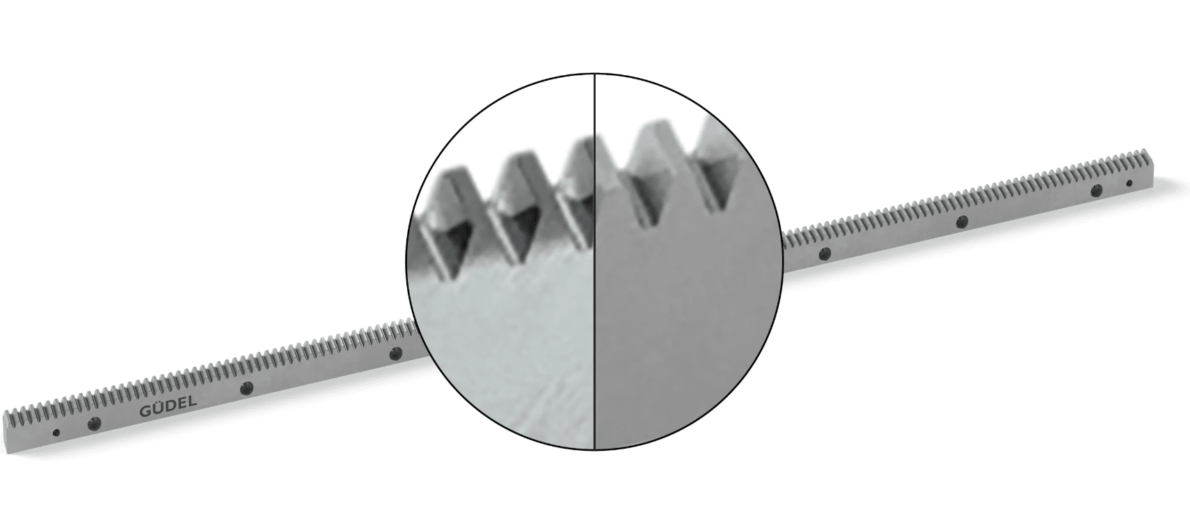Güdel racks are available in modules ranging from M1 to M10. You can choose between helical teeth for smooth, low-noise operation or straight teeth for direct power transmission. The components are supplied in standard lengths of 0.5 meter, 1 meter, or 2 meters.